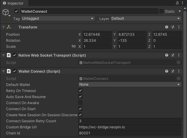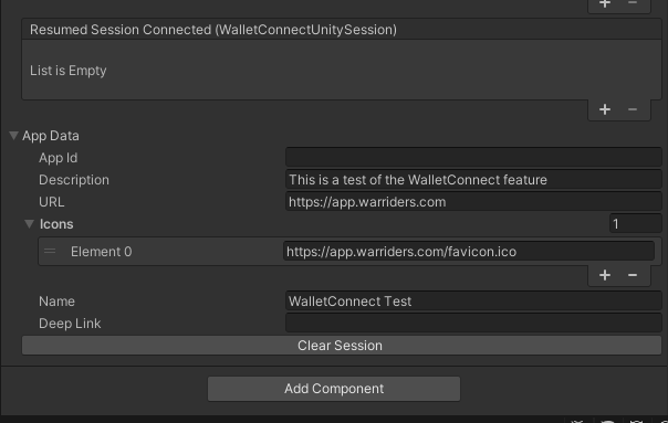 To use WalletConnect in your Unity project, simply create an empty GameObject in your Scene and attach the `WalletConnect` component to your GameObject. Attaching this script will automatically attach any required components as well