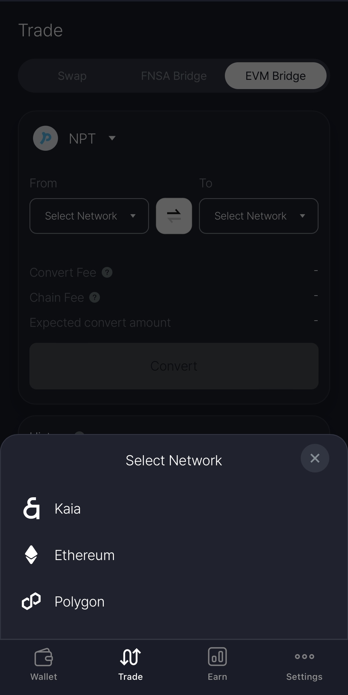 For NPT, USDT or ETH, choose **\[EVM Bridge] tab** and for Kaia, choose **\[FNSA Bridge] tab**
