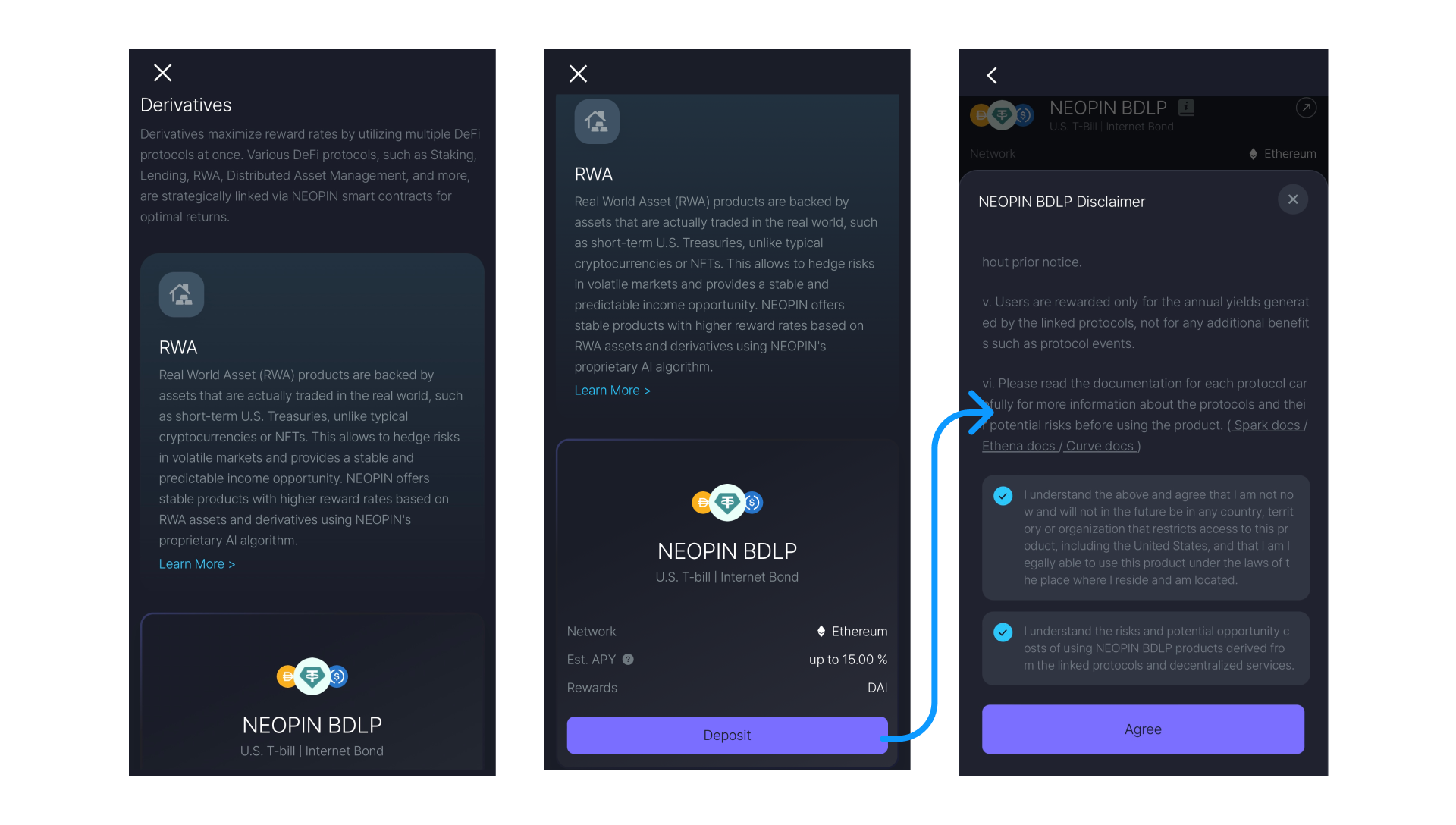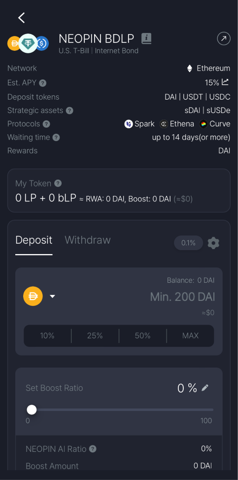 Go to the [Earn] tab > Select [Derivatives] in the Discover section > Select [NEOPIN BDLP] in the RWA section.