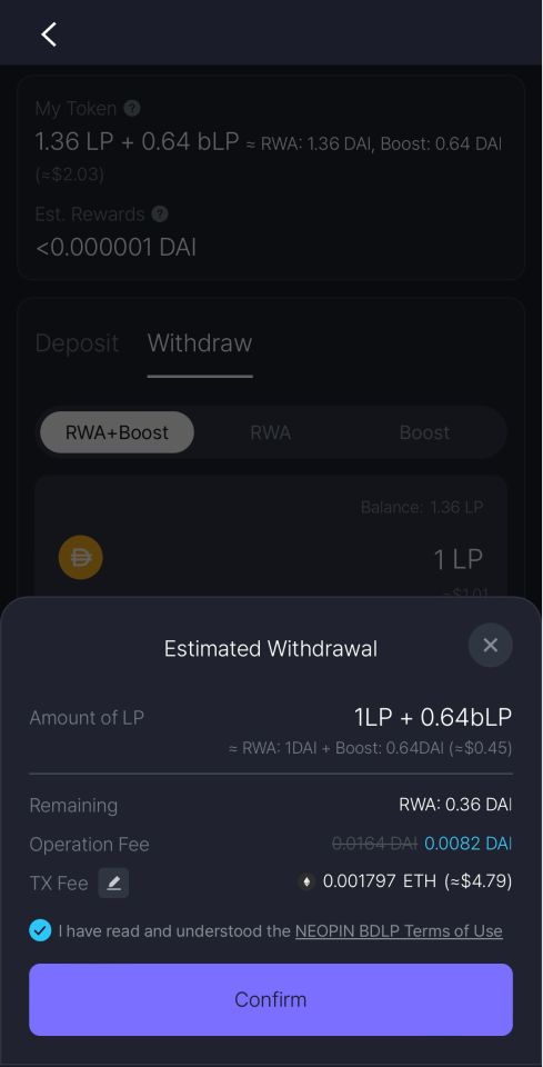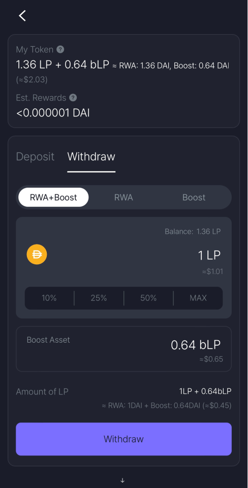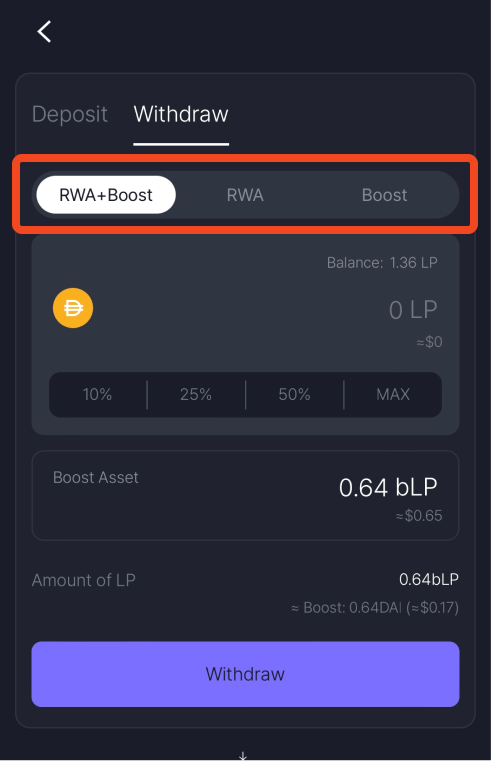 Select the [Withdraw] tab at the top and choose options to withdraw: you can withdraw RWA and Boost assets together, RWA assets only or Boost assets.