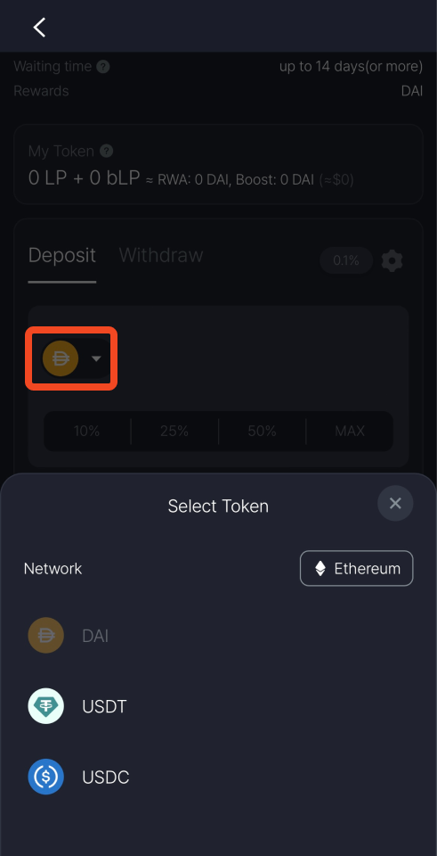 Choose the token you want to deposit, you can deposit with DAI, USDT or USDC.