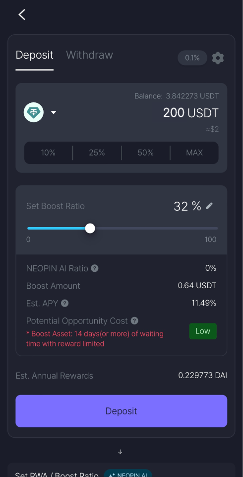 NEOPIN's proprietary AI algorithm will recommend a boost percentage based on your previous activity in NEOPIN.