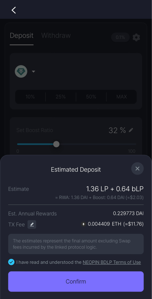 In the deposit details, you can check your DAI converted value of LP and bLP Token and your estimated rewards in DAI.