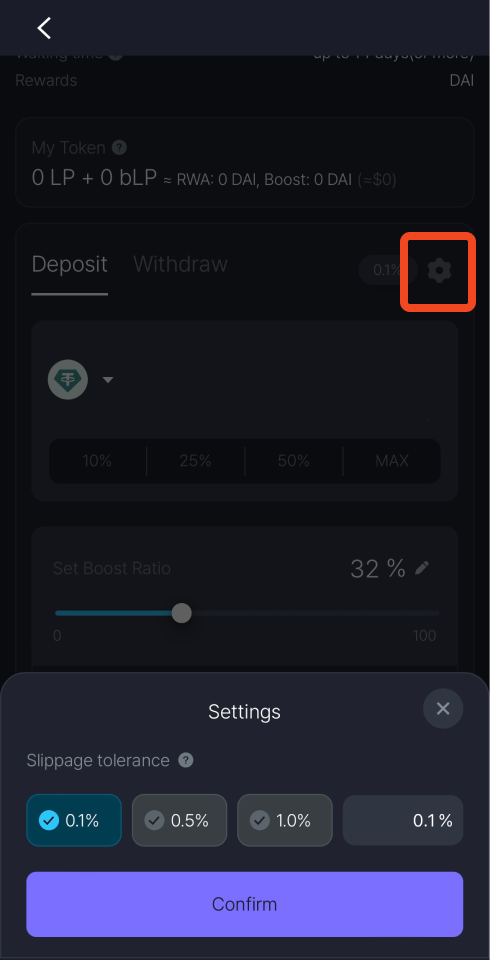 You can also set the slippage tolerance as the deposit process includes stable swap between utilized assets. The default is set to 0.1%.