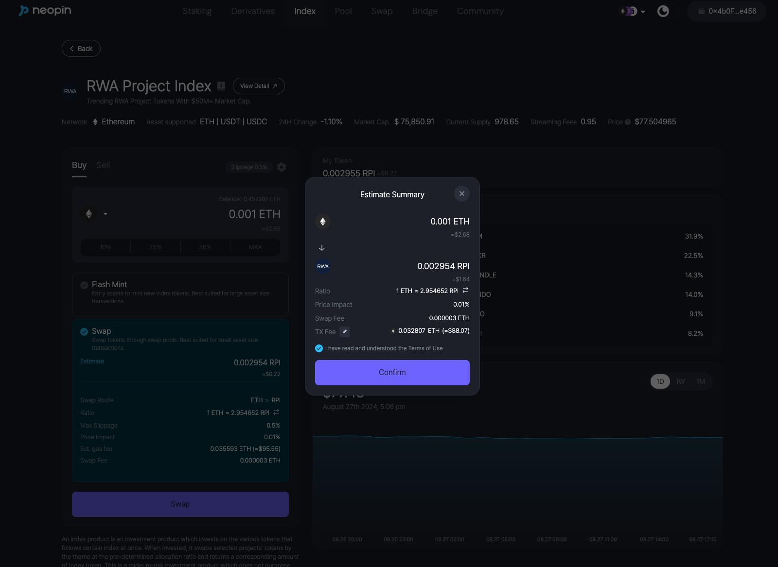 Carefully review the product information, and choose the token you want to use to acquire Index tokens. Entry tokens available are ETH, USDT or USDC.