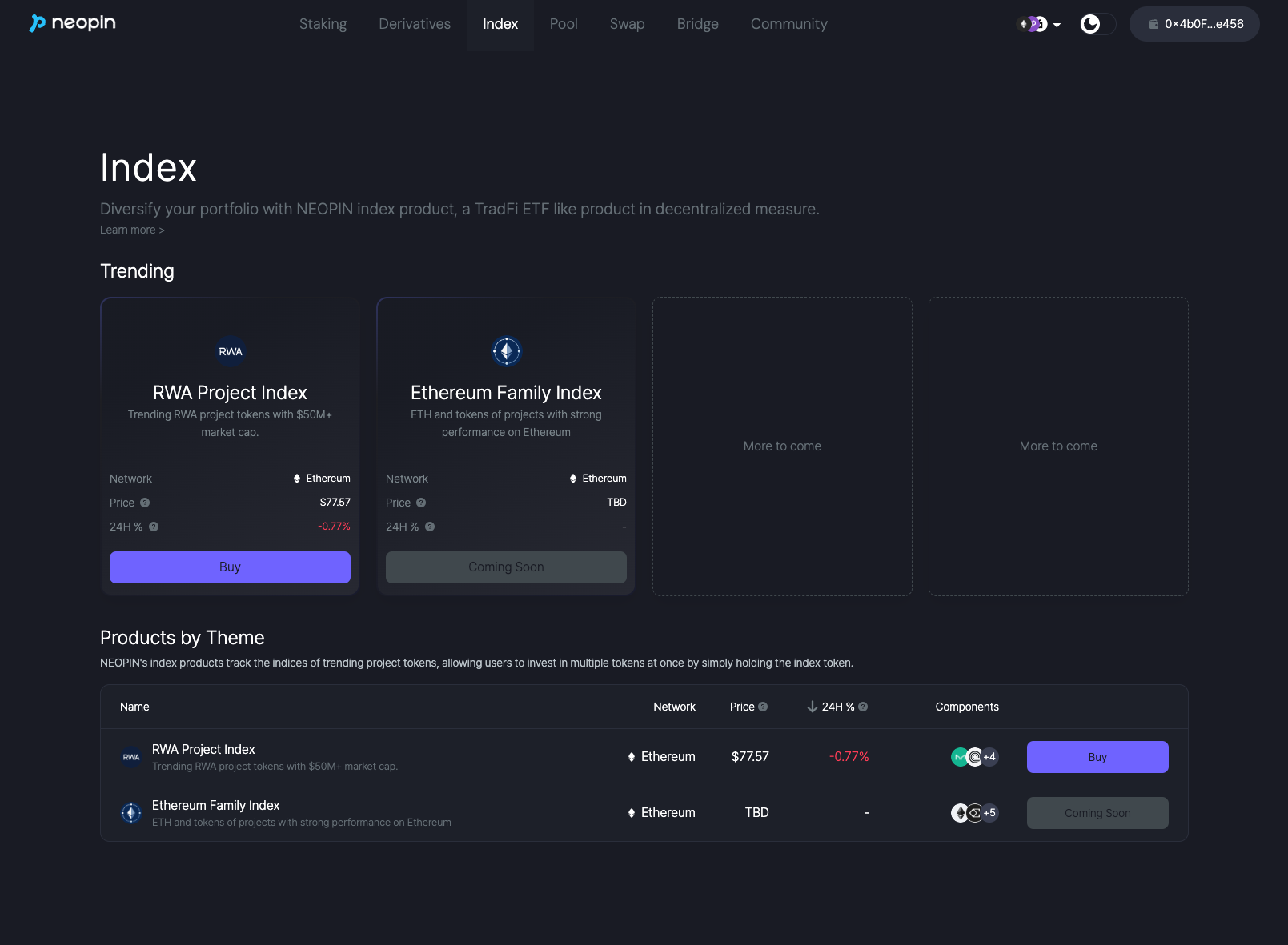 To use the Index service on the NEOPIN Web, you need to connect your wallet first. Click the [Connect Wallet] button and select the wallet you would like to connect. For NEOPIN wallet users, please refer to the section below to connect your wallet to the web for full access to the NEOPIN Web services. ▶ Review details on #5.-web-connect-your-neopin-wallet