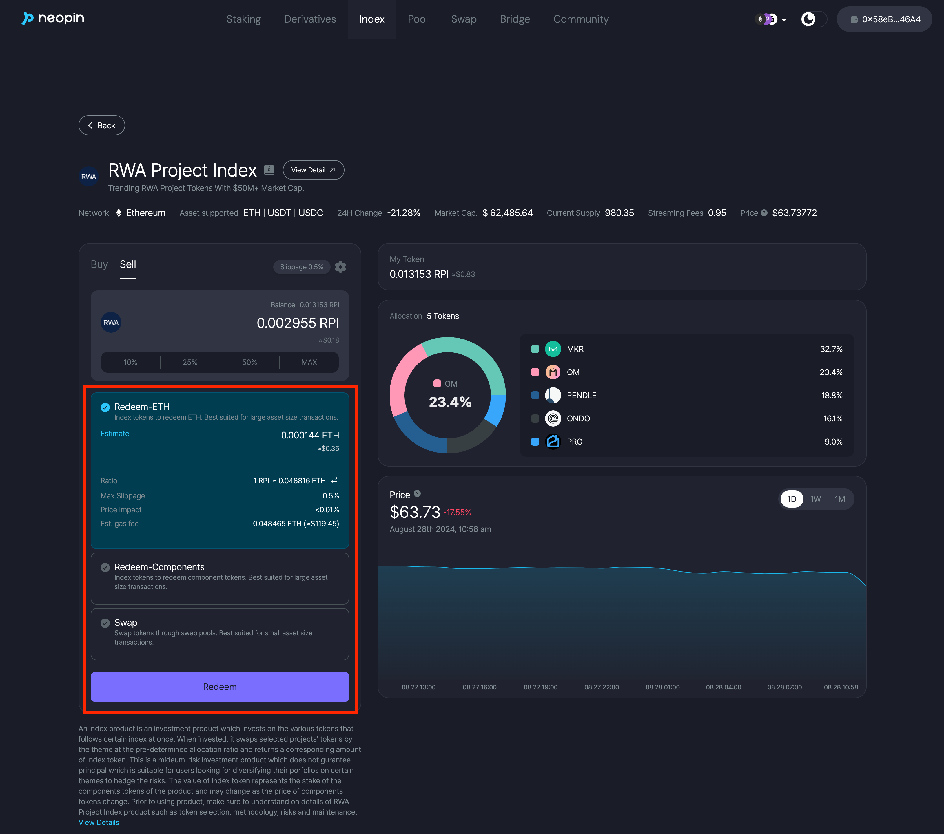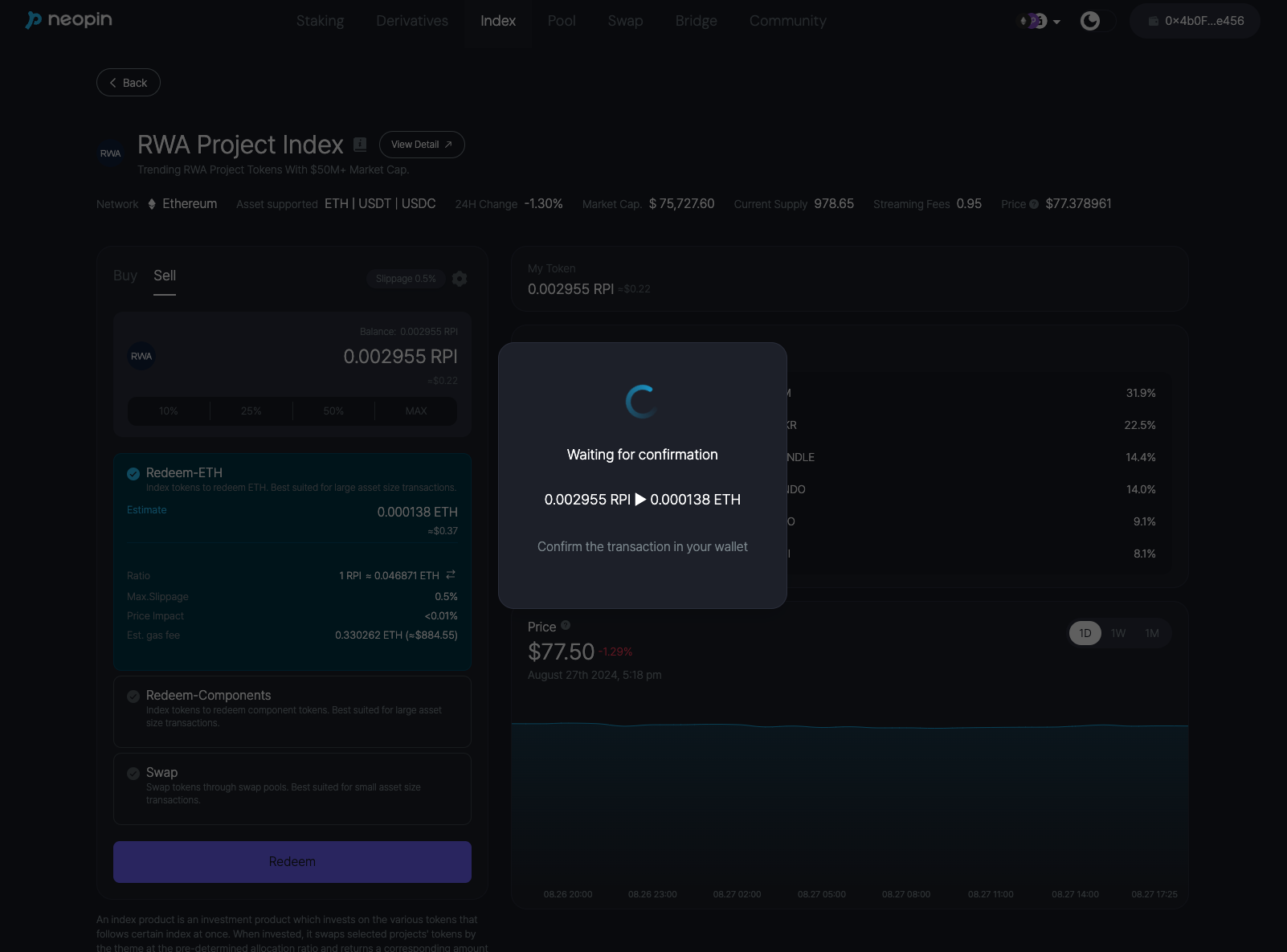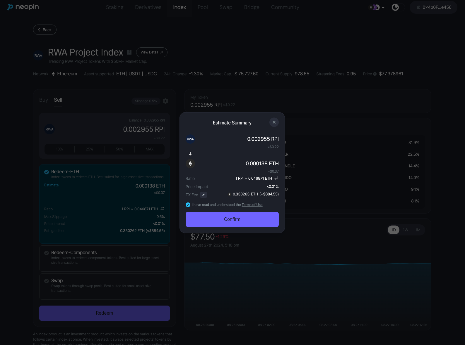 The Flash Redeem-ETH options involve swaps using Uniswap. As the transaction progresses, swap fees and slippage may occur due to the execution of logic, which is considered within the price impact value shown in the product details.