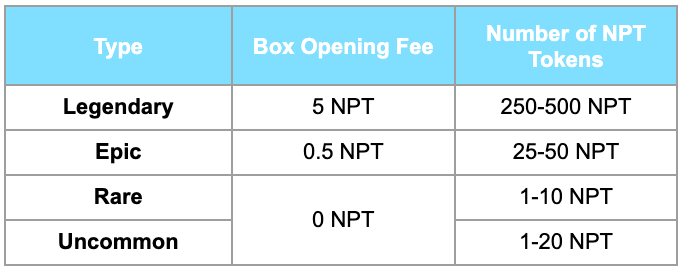 The table below provides information about the various types of Gift Boxes available, including associated box opening fees and the potential range of NPT tokens you can obtain when opening each type of box.