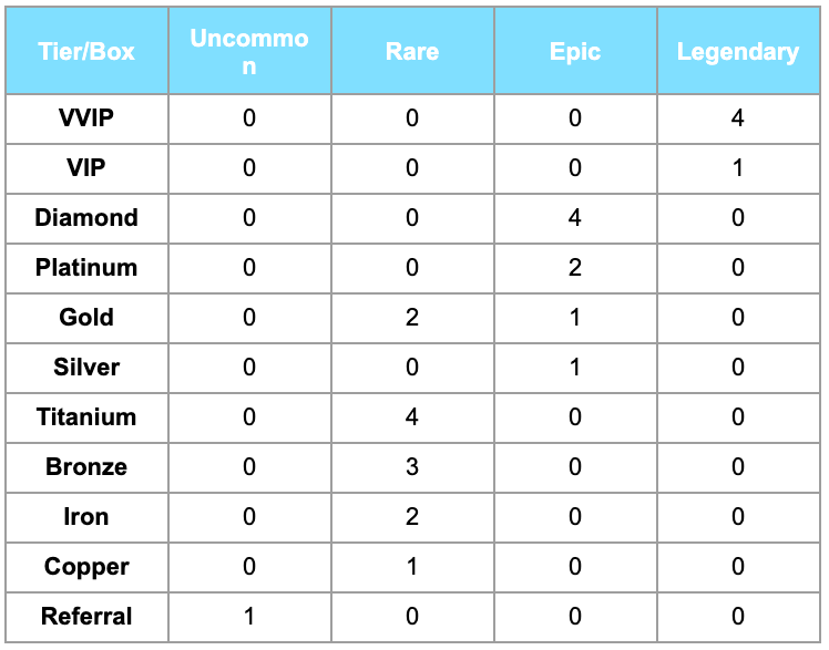 There are four types of Gift Boxes: Legendary, Epic, Rare, and Uncommon. Legendary boxes will contain significantly more NPTs than Uncommon boxes. The number of Gift Boxes you earn is based on your Tier. Advancing to higher tiers increases the probability of opening boxes that contain more NPTs.